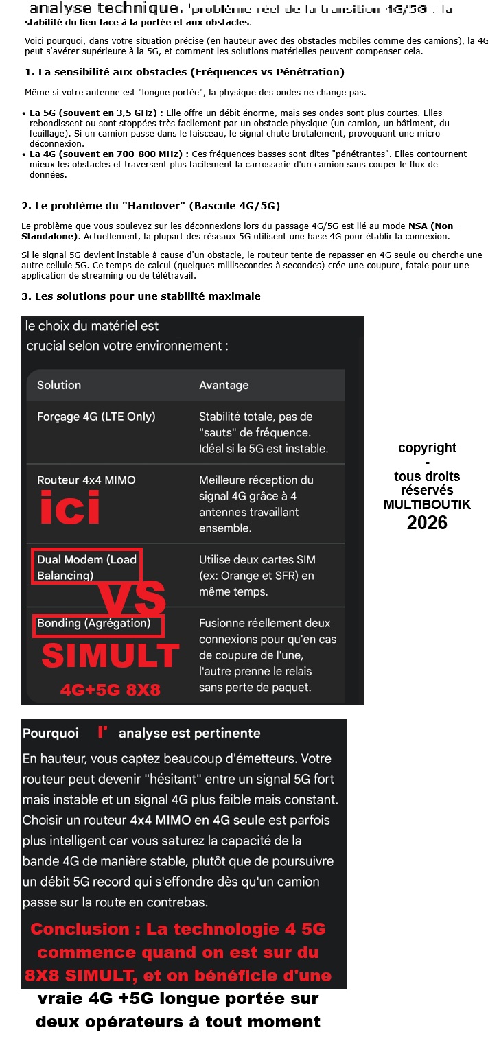 Donc les solutions qu'on propose sur les solutions 4G 5G 4X4 chez nous depuis 2021, ou ailleurs depuis fin 2024, ce sont uniquement des solutions 4X4 avec coupures possibles de 4G à 5G ou vice versa sans technologies, excepté quatre (4) connexions sur un seul relais (et avec un meilleur débit); dans certains usages le 4X4 CAT16 est bien meilleur !!!